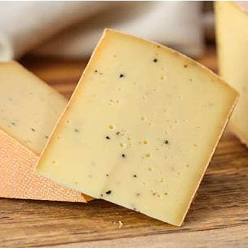 Leckerer Halbhartkäse mit Trüffel. Mit fruchtigem und pflanzlichem Geschmack (von +- 250 g bis +- 500 g)